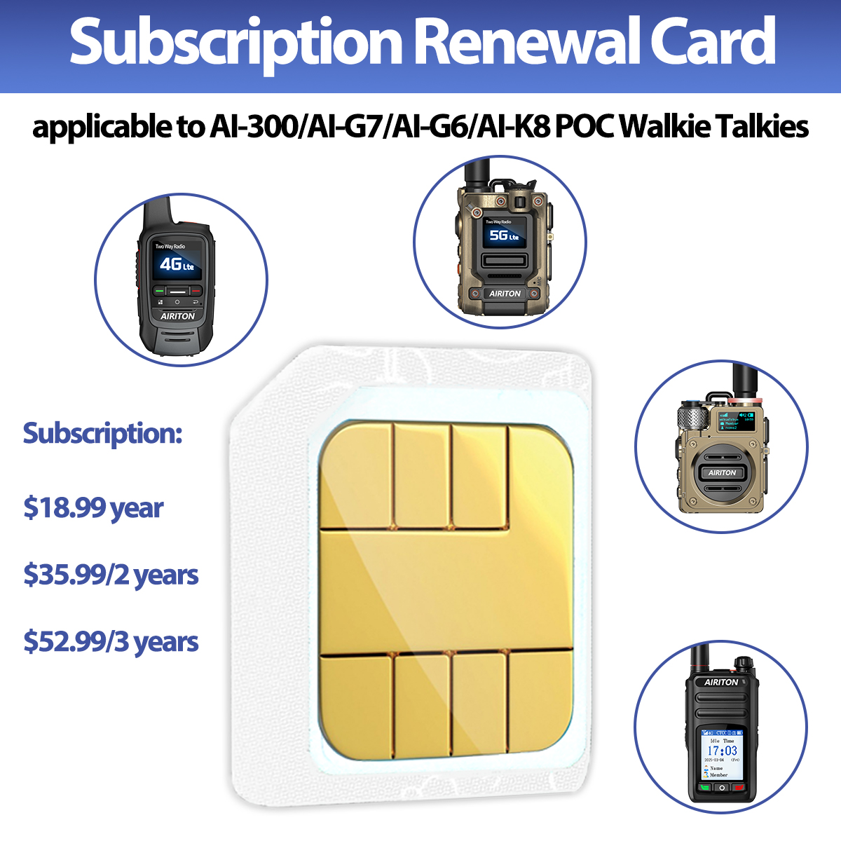 AI-300/AI-G7/AI-G6/AI-K8 Public Network Walkie Talkie Service Renewal Card, 4G Unlimited Range Intercom Annual Fee Subscription Card for Two Way Radio